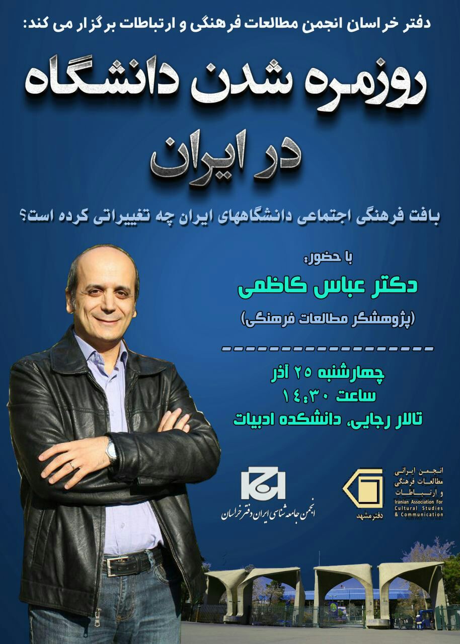 جلسه سخنرانی با موضوع «روزمره شدن دانشگاه در ایران» از سوی دفتر خراسان انجمن مطالعات فرهنگی و ارتباطات با همکاری انجمن جامعه‌شناسی دفتر خراسان برگزار می‌شود. این نشست با حضور دکتر عباس کاظمی، عضو هیئت علمی پژوهشکده مطالعات فرهنگی و اجتماعی وزارت علوم روز چهارشنبه 25 آذرماه، ساعت 14:30 در دانشکده ادبیات، تالار رجایی برپا می‌شود.