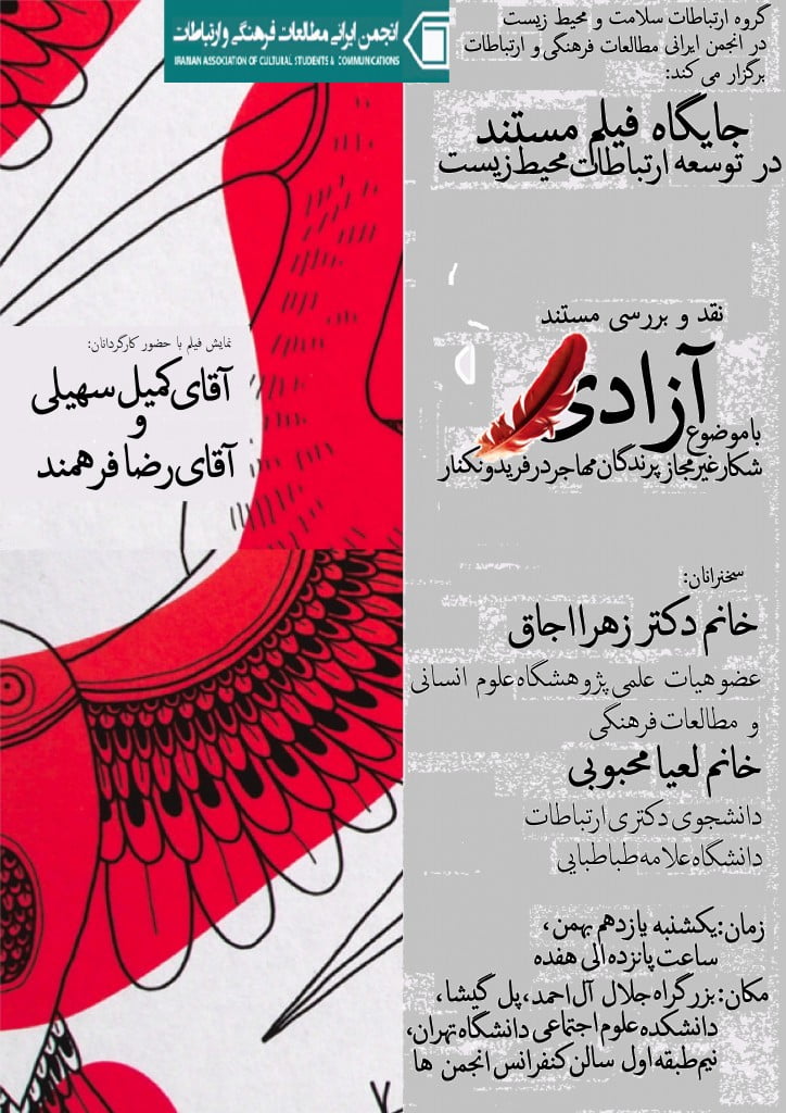 نشست «جایگاه فیلم مستند در توسعه ارتباطات محیطزیست» از سوی گروه ارتباطات سلامت و محیطزیست انجمن ایرانی مطالعات فرهنگی و ارتباطات برگزار میشود. این همایش با سخنرانی خانم دکتر زهرا اجاق عضو هیئت علمی پژوهشگاه علوم انسانی و مطالعات فرهنگی و خانم لعیا محبوبی دانشجوی دکتری ارتباطات دانشگاه علامه طباطبایی روز یکشنبه یازدهم بهمنماه 1394 ساعت 15 تا 17 در محل سالن کنفرانس انجمنها واقع در بزرگراه جلال آل احمد، پل گیشا، دانشکده علوم اجتماعی دانشگاه تهران برپا میشود. همچنین نقد و بررسی «مستند آزادی» با موضوع شکار غیر مجاز پرندگان مهاجر در فریدونکنار با حضور کارگردانان آقایان کمیل سهیلی و رضا فرهمند انجام میشود.