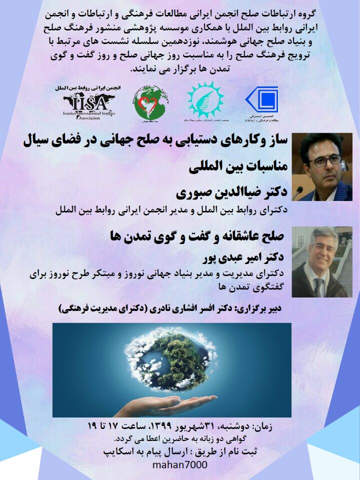 گروه ارتباطات صلح انجمن ایرانی مطالعات فرهنگی و ارتباطات و انجمن ایرانی روابط بینالملل با همکاری موسسه پژوهشی منشور فرهنگ صلح و بنیاد صلح جهانی هوشمند، نوزدهمین سلسله نشست مرتبط با ترویج فرهنگ صلح را به مناسبت روز جهانی صلح و روز گفتوگوی تمدنها برگزار میکند.
