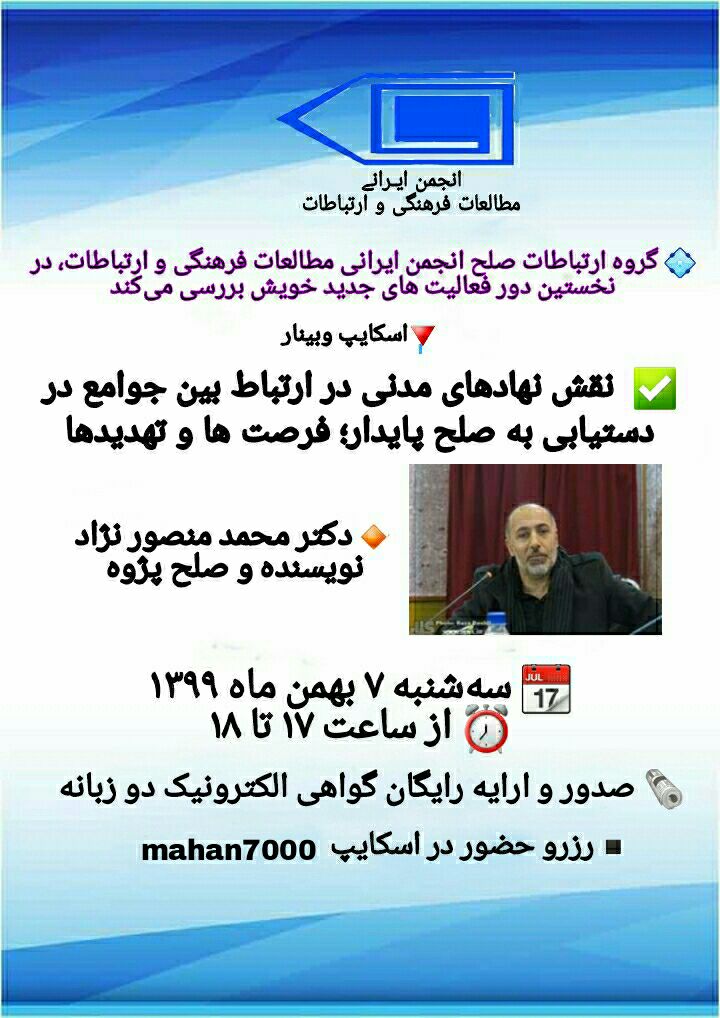 اسکایپ وبینار نقش نهادهای مدنی در ارتباط بین جوامع در دستیابی به صلح پایدار؛ فرصتها و تهدیدها