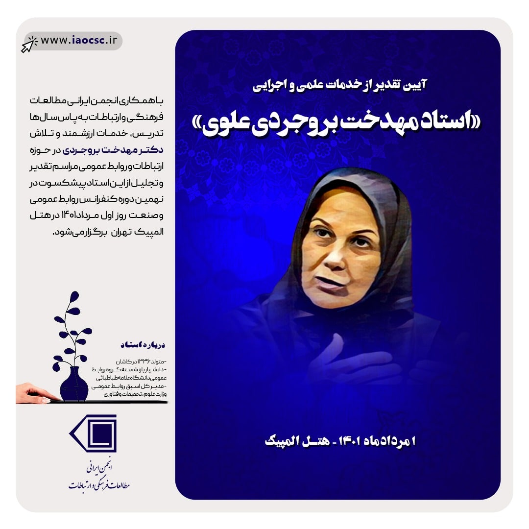 مراسم بزرگداشت و تقدیر از خدمات ارزشمند علمی و اجرایی خانم دکتر مهدخت بروجردی علوی روز شنبه یکم مردادماه ۱۴۰۱، در هتل المپیک تهران همزمان با برگزاری نهمین کنفرانس روابط عمومی و صنعت با موضوع اصلی «روابطعمومی صنعت در ایران؛ تجربهها و روندها» برگزار شد.