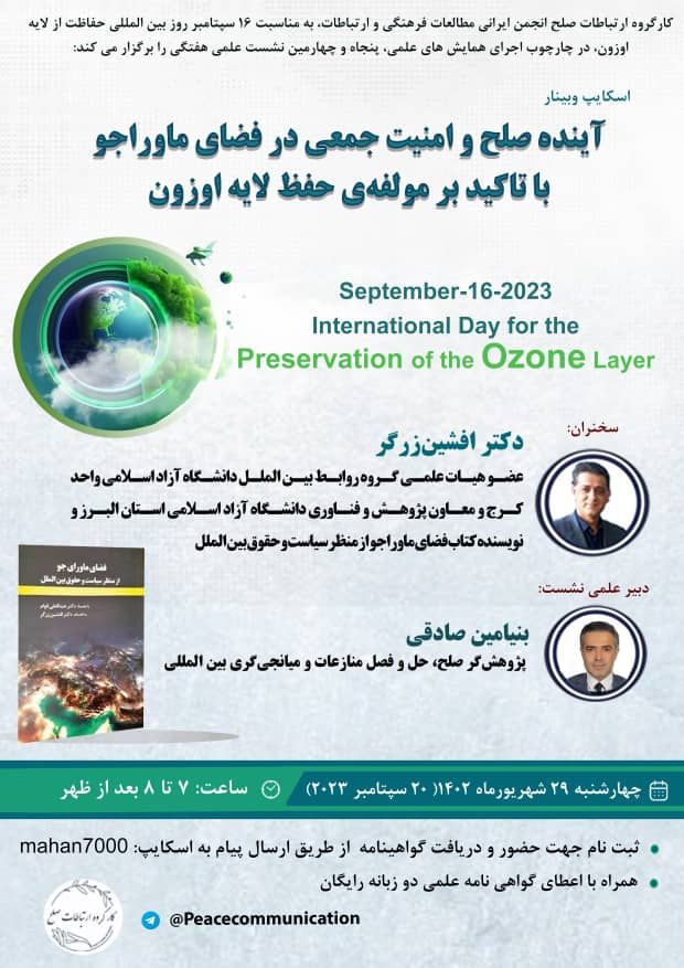 گروه ارتباطات صلح انجمن ایرانی مطالعات فرهنگی و ارتباطات به مناسبت ۱۶ سپتامبر، روز بینالمللی حفاظت از لایه اوزون، برگزار میکند: