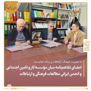 این تفاهم نامه در راستای اجرایی کردن بخشی از اساسنامه موسسه کار و تامین اجتماعی و همچنین ایجاد ارتباط علمی، فنی، تحقیقاتی، آموزشی و تبادل نظر بین محققان، متخصصان و همکاری با انجمن ایرانی مطالعات فرهنگی و ارتباطات به امضای «ابراهیم صادقیفر» رئیس موسسه کار و تامین اجتماعی و «علی ربیعی» رییس انجمن ایرانی مطالعات فرهنگی و ارتباطات رسید.