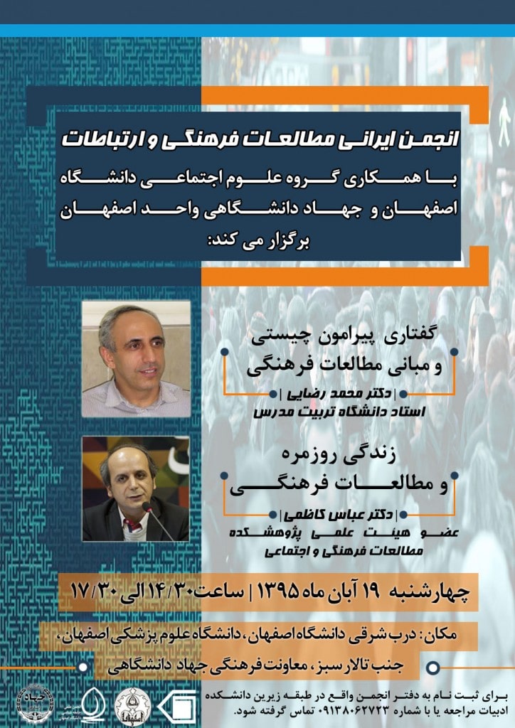 انجمن ایرانی مطالعات فرهنگی و ارتباطات با همکاری گروه علوم اجتماعی دانشگاه اصفهان و جهاد دانشگاهی واحد اصفهان در نظر دارد نشستهایی با عنوان زیر برگزار کند: